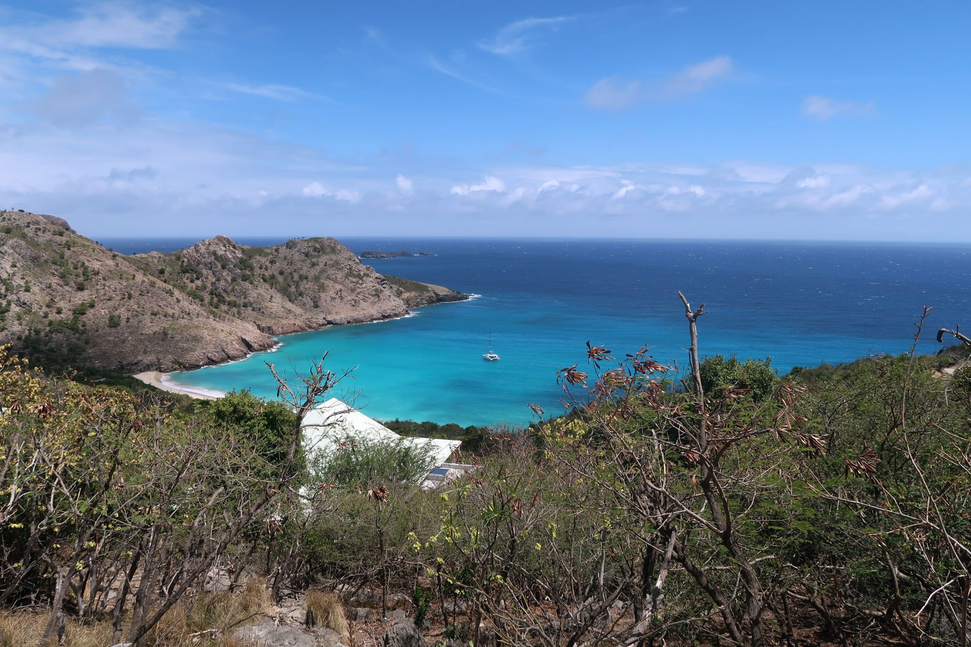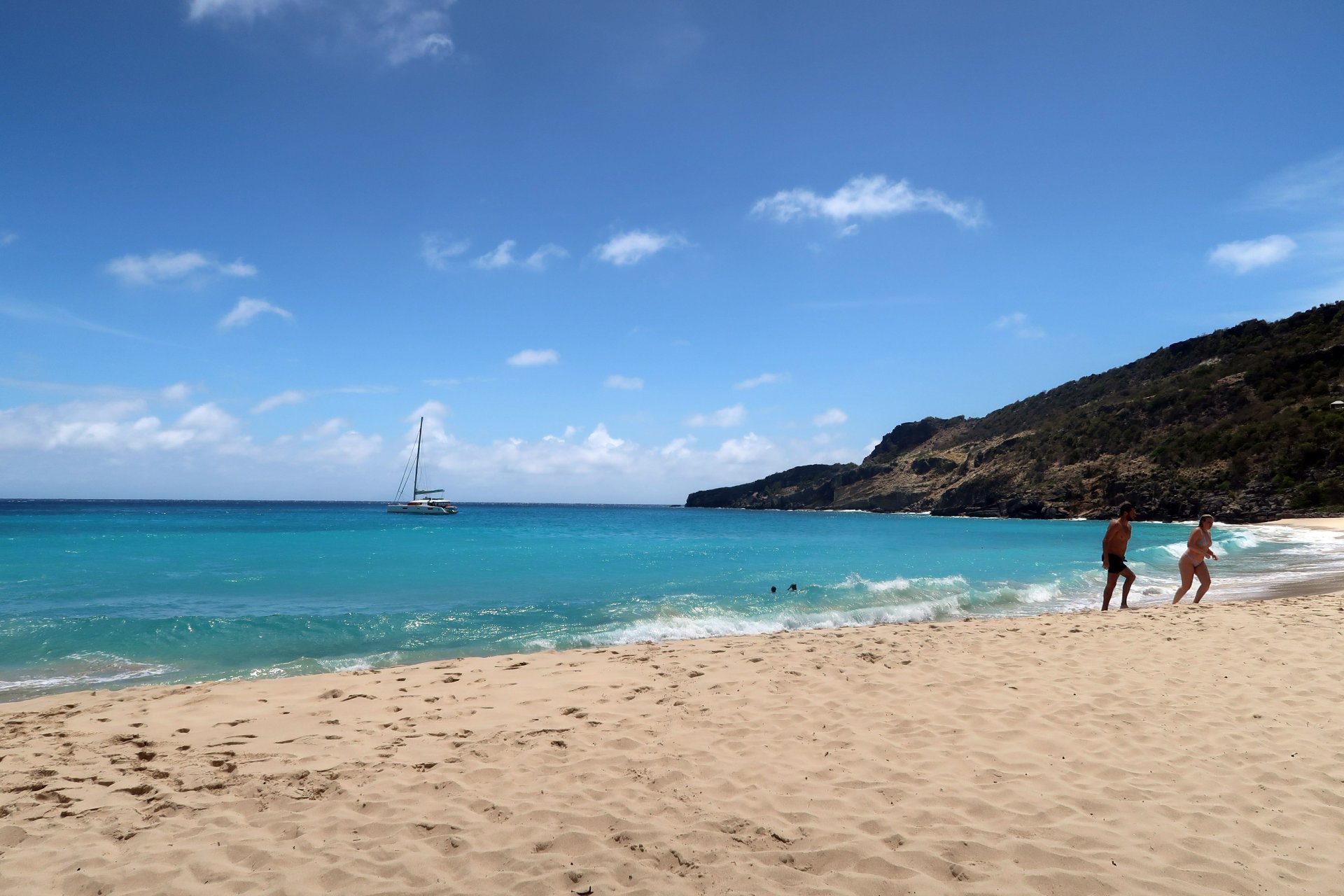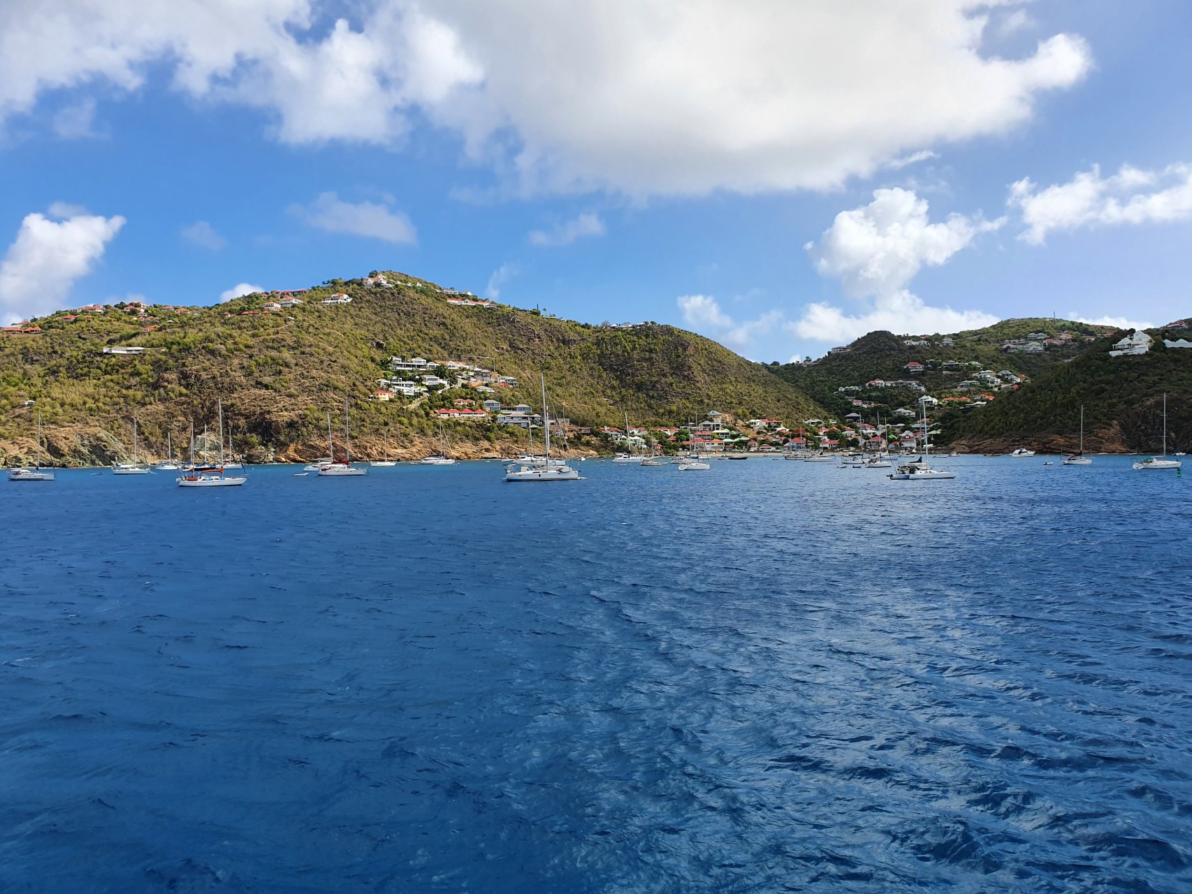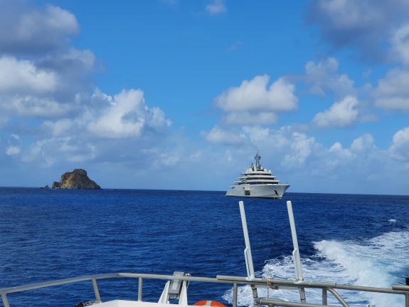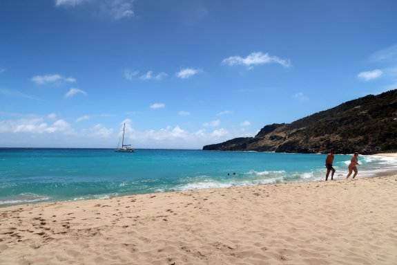 Doprava: Na St. Barth se dostanete z Sv. Martina buď lodí nebo letadlem. Pro dobrodružnější povahy doporučuji loď. Vyjíždějí z Philipsburgu nebo z Marigot a přezdívá se jim vomit comet, tedy, omlouvám se za ten výraz, blicí kometa. Cesta trvá necelou hodinu. A skutečně je tomu tak, zejména pokud je moře "a bit choppy", tedy trochu neklidné. To znamená, že je moře "poněkud neklidné" jako byl otec v seriálu 30 případů majora Zemana, v díle Studna. Zažil jsem ledacos, ale že jsme se propadali tak, že okno kormidelny bylo pod vodou a vzápětí jsme se dívali vzhůru do nebe, to jsem tedy na komerční lince nezažil. Všichni na horní palubě jsme byli mokří, jak můžete vidět na přiložené fotce, od hlavy až k patě, ale jako jedni z mála jsme to přežili bez ztráty důstojnosti, byť jsme vypadali na to, že jsme na ostrov doplavali a ne přijeli lodí. Projížídí se totiž místem, kde se Atlantk spojuje s Karibikem, vystaveným bez ochrany vlnám z Atlantiku poháněných pasátovými východními větry (běžné vlny 2 a 4 metry, ale v zimním období to může být i 6 a více metrů s poměrně krátkou periodicitou 12 až 14 sekund). Tento zážitek je třeba rezervovavt předem. Doporučujeme si vybrat místo v silně vychlazeném podpalubí uprostřed, kde se houpání lodí tak moc neprojevuje.